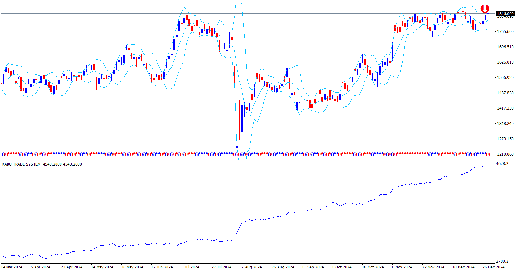 サインの確認は、システムを導入したチャート上から行います。ロジックには自己復帰機能を搭載した強固なストラテジーを内包しており、優れた運用パフォーマンスを叩き出しています。